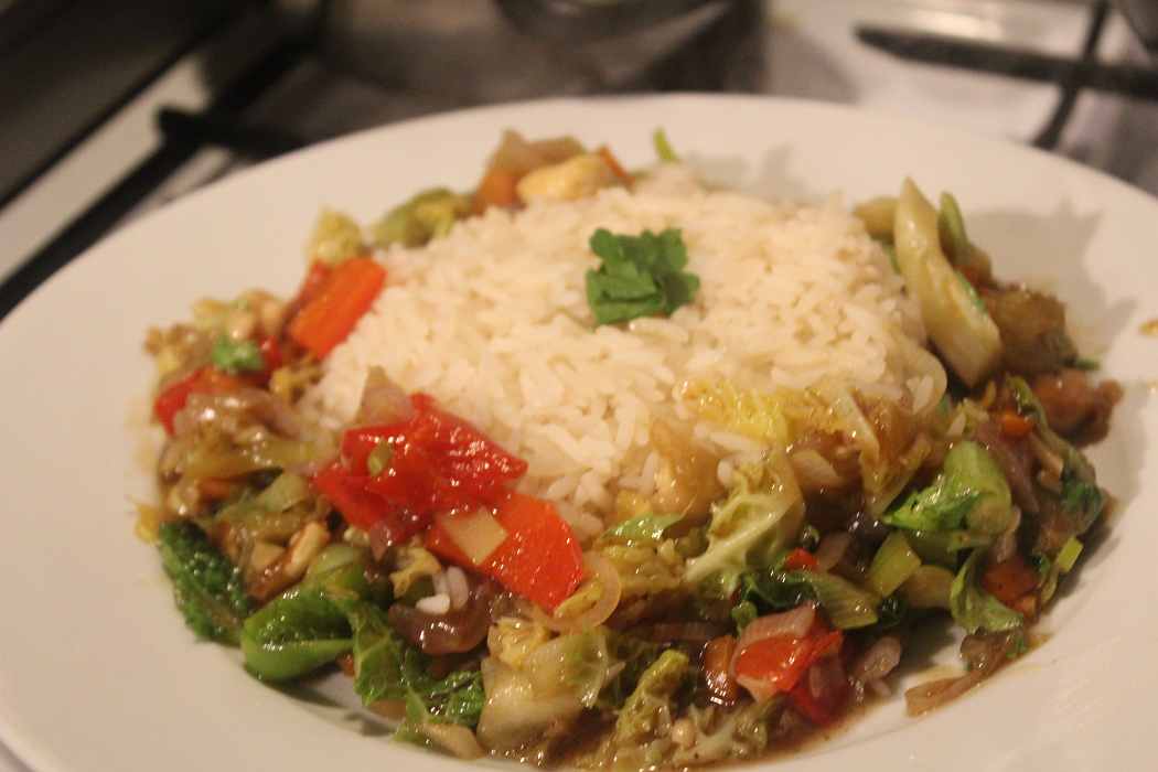 Ich weiß gar nicht, was mit mir im Moment falsch ist, aber ich esse zur Zeit gerne Reis. Das hat mir zeitlebens nichts gesagt, aber meine Familie meckert darüber auch nicht, also reite ich den Gaul erstmal ein bisschen, bis jemand sagt dass Nudeln, oder Kartoffeln auch mal wieder ganz nett wären. Bedingt durch meine Ladenöffnungszeiten von 9 bis 19 Uhr sollte das Essen in der Woche ziemlich schnell gehen. Hier kommt ein veritables 30 Minuten Gericht für Euch und vegetarisch ist es auch noch.