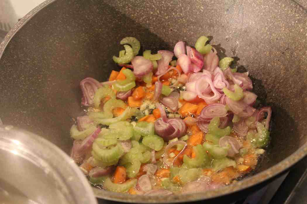 Gemüse anbraten, bis es glasig wird.