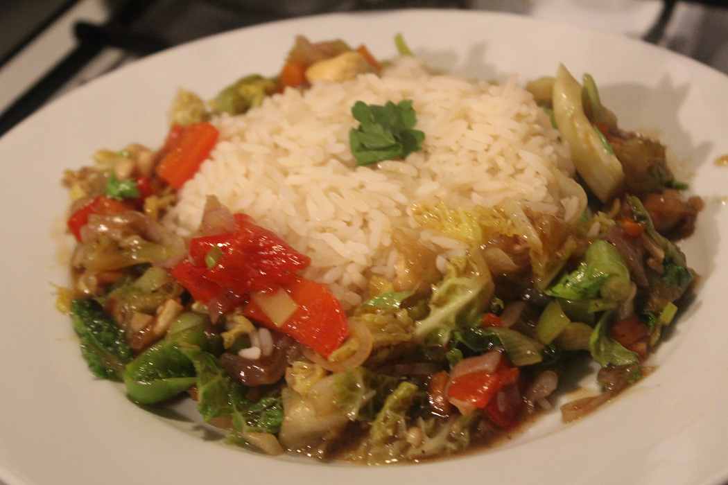 Sehr lecker! Frisches Gemüse in einer einfachen und würzigen Soße mit Reis. Dabei vermisse ich kein Fleisch und nehme gerne noch einmal nach.