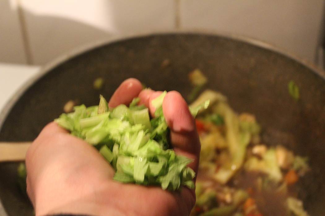 Jetzt noch das frische Grün des Selleris in den Wok werfen