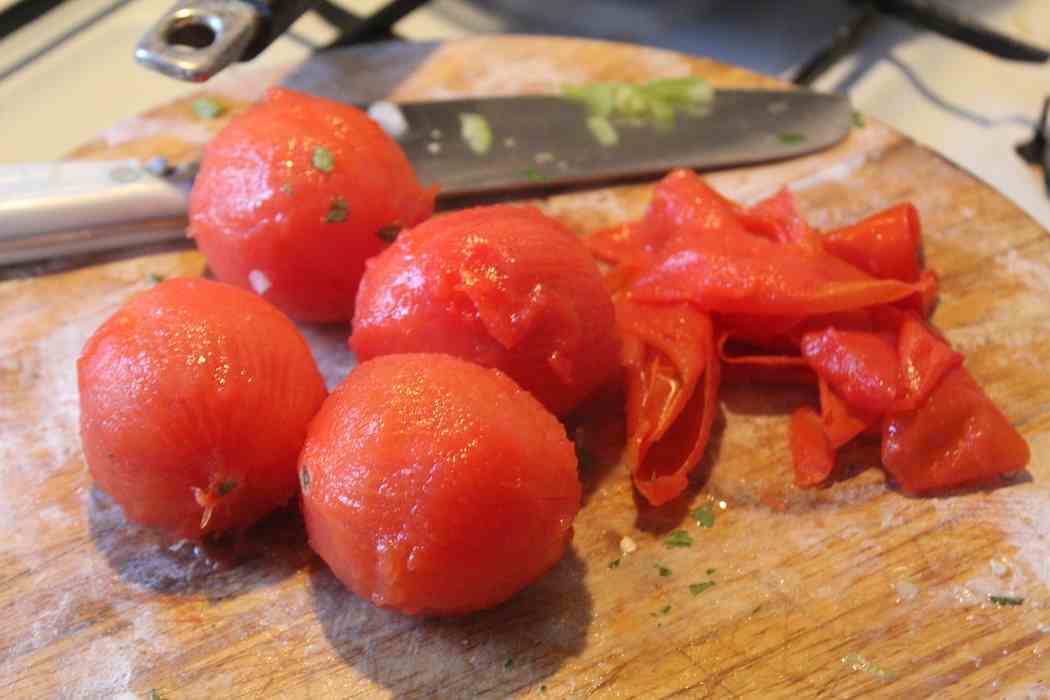 Tomaten aus dem heißen Wasser holen. Die Schale kann man so mit den Fingern abziehen.