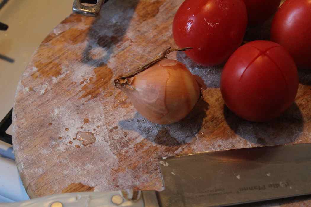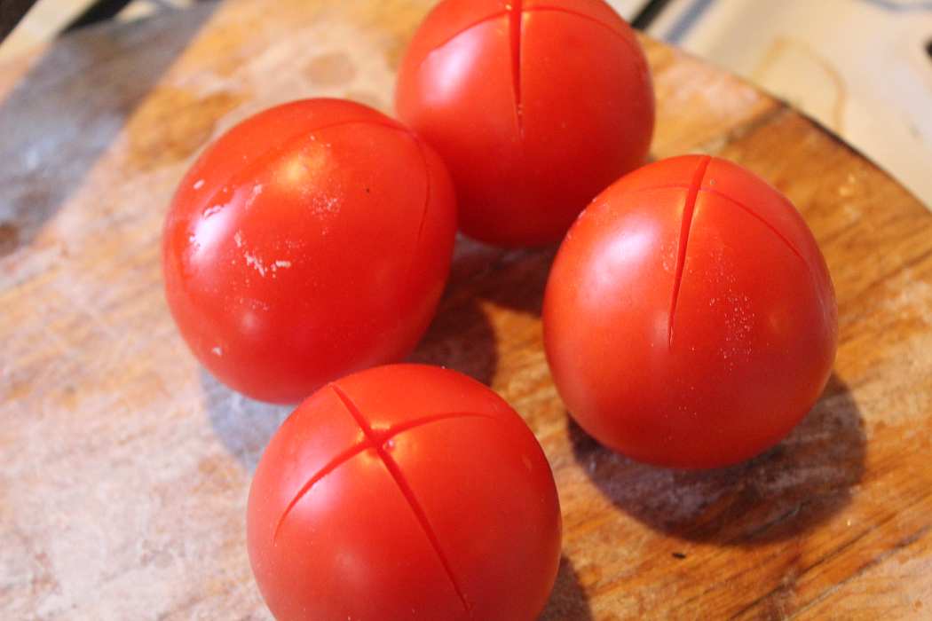 4 Tomaten über Kreuz einschneiden und mindestens einen Liter Wasser zum Kochen bringen.
