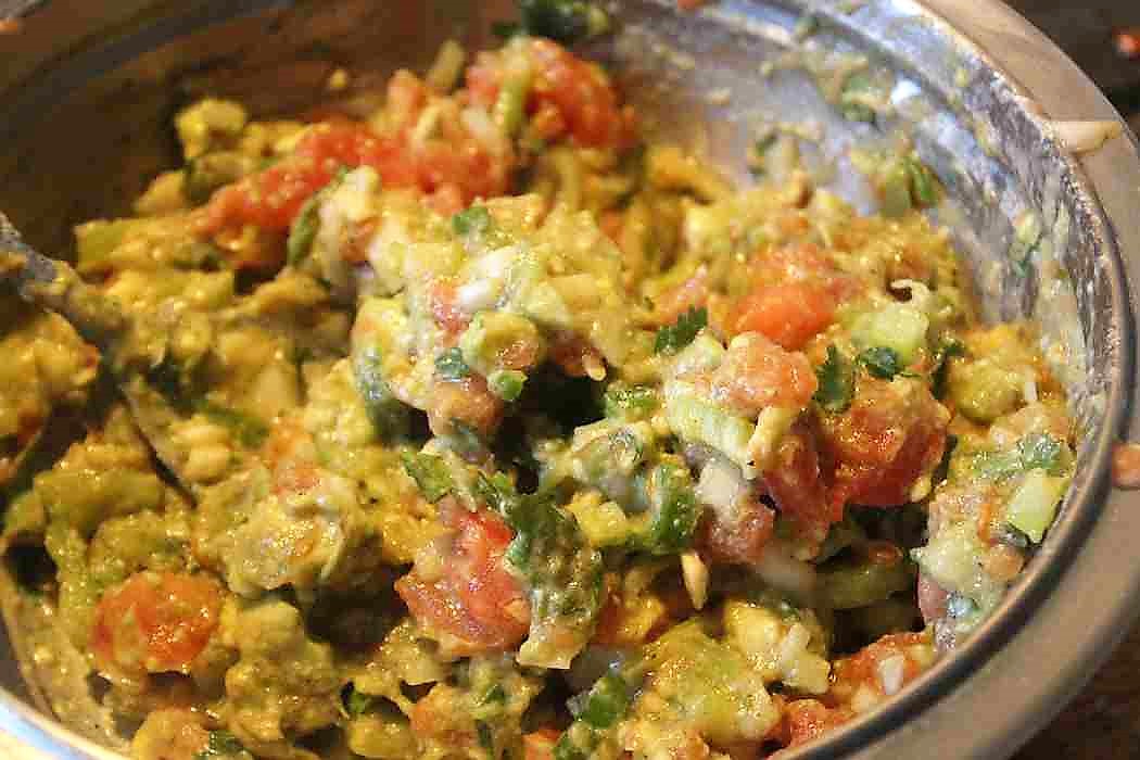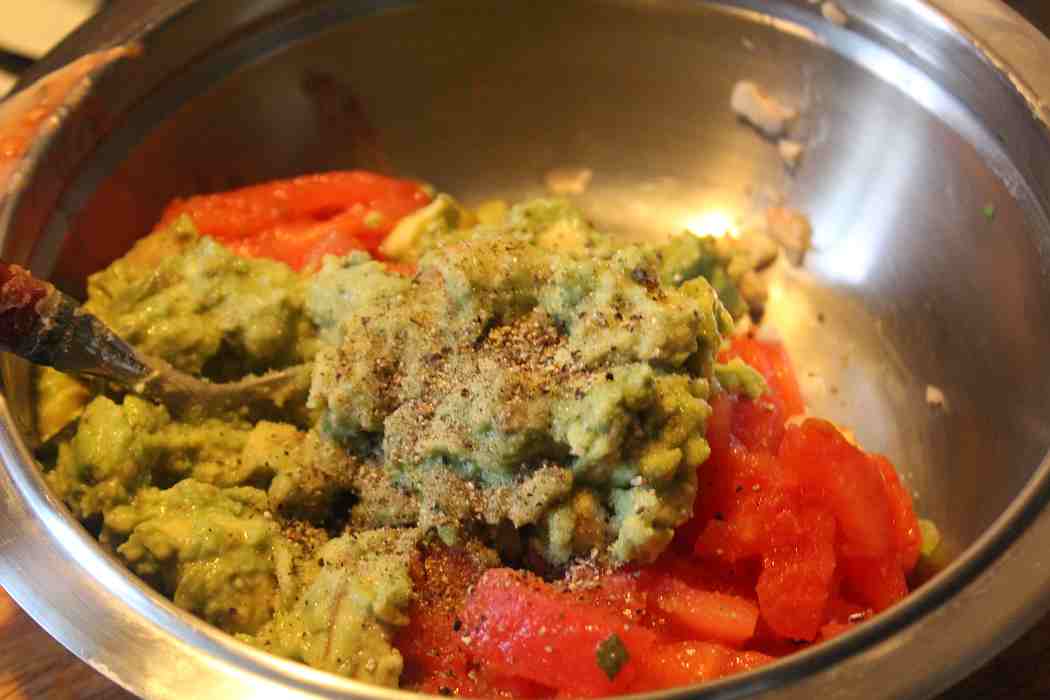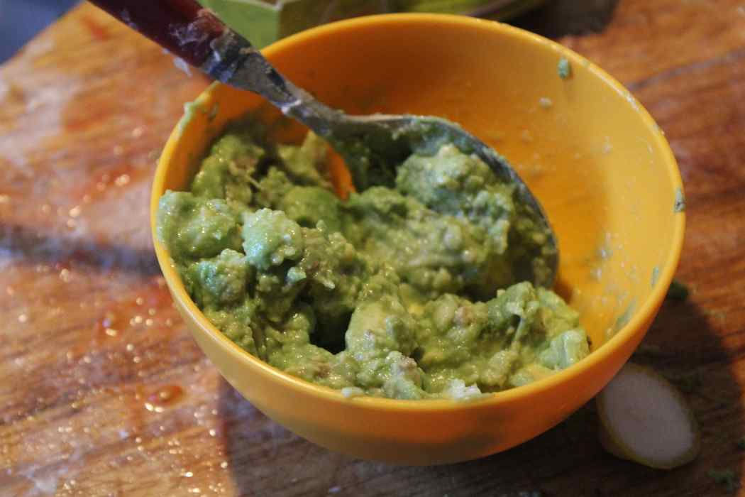 Mit einem Löffel wird die Avocado zermanscht und verrührt.