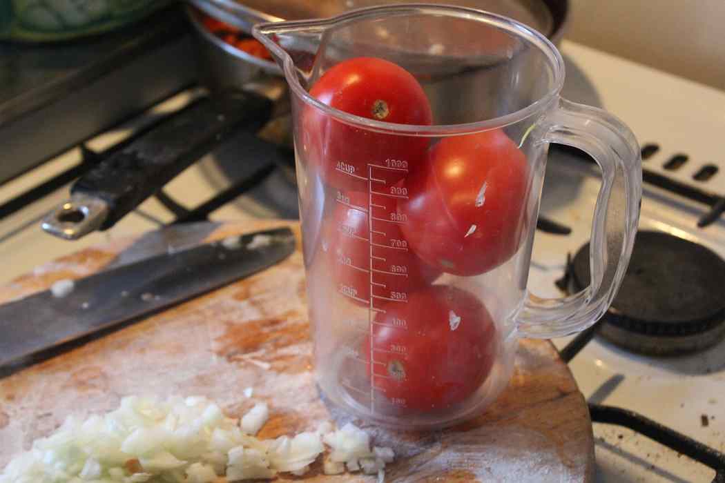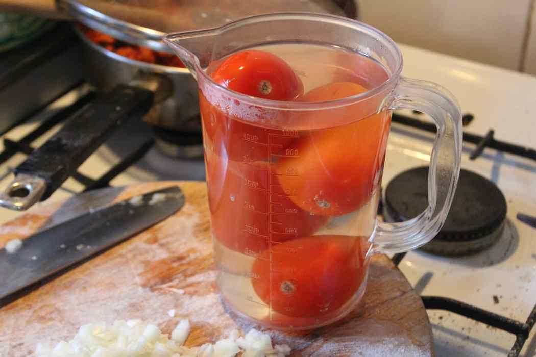 Tomaten in ein Litermaß stapeln und mit dem kochenden Wasser begießen.