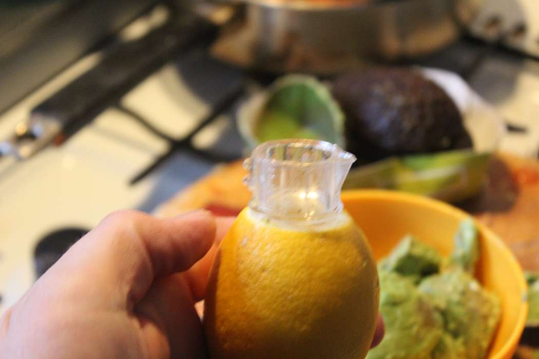 Den Saft einer Zitrone über die Avocadomasse geben, damit sie nicht braun wird.