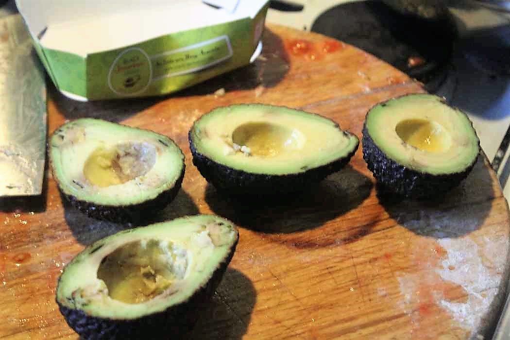 Mit einem Esslöffel das Fruchtfleisch aus den Avocadohälften holen