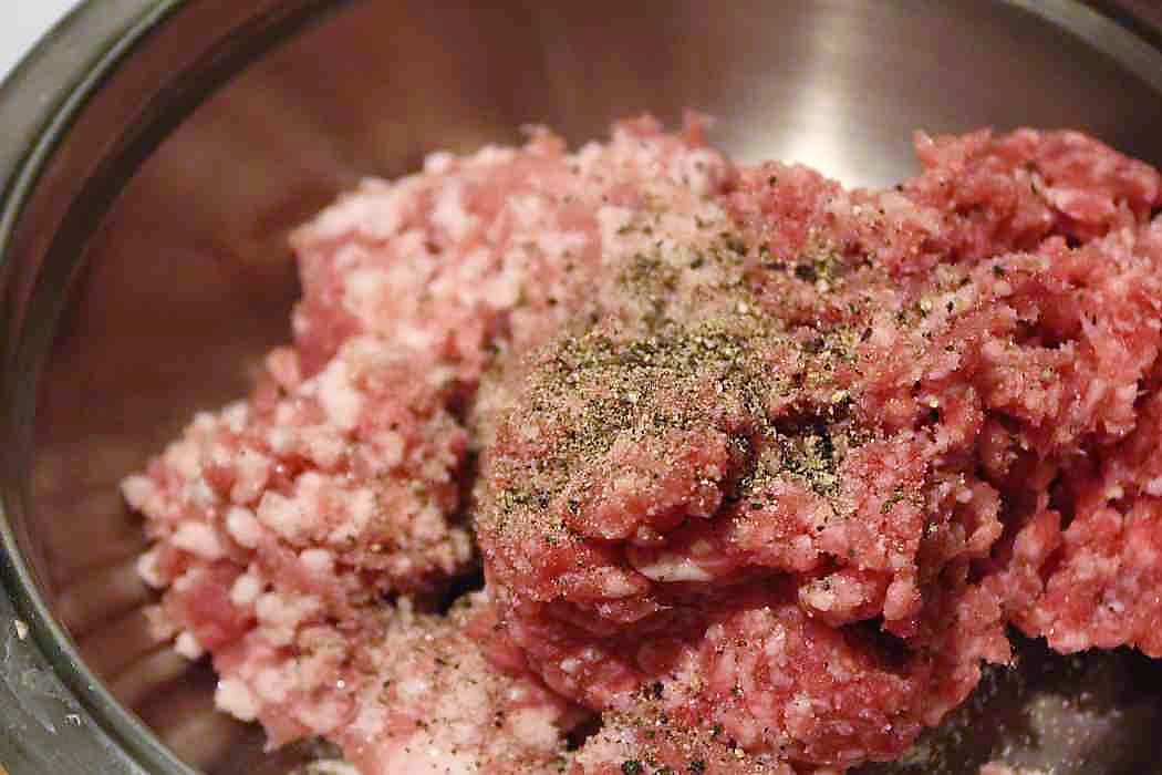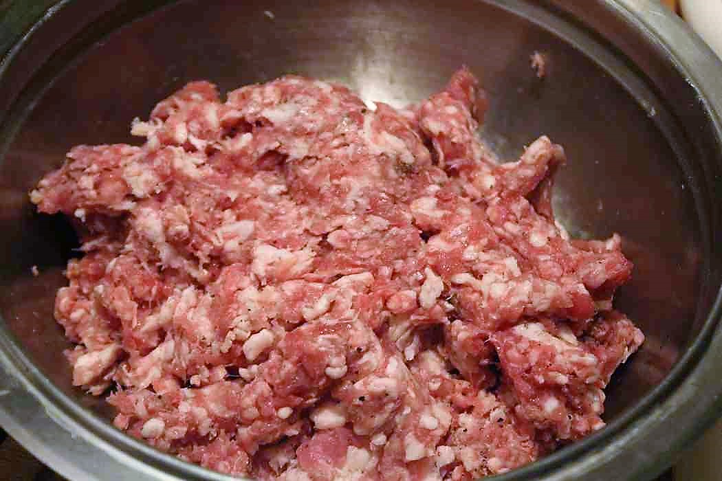 Je 250 Gramm Rinderhack und Schweinehack in eine Schüssel geben. Natürlich kann man als Hindu auch 500 Gramm vom Schwein, oder als Moslem 500 Gramm Rind verwenden. Vegetariern empfehle ich 500 Gramm Sojagranulat.