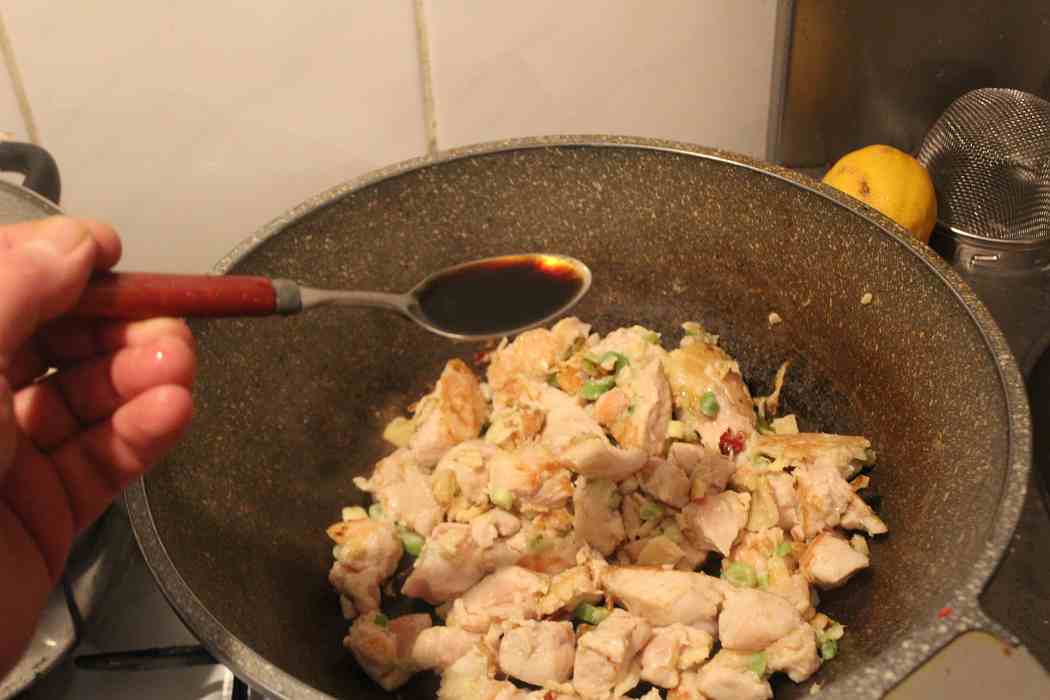 200 Milliliter Brühe in den Wok geben und die Temperatur auf geringe Hitze reduzieren