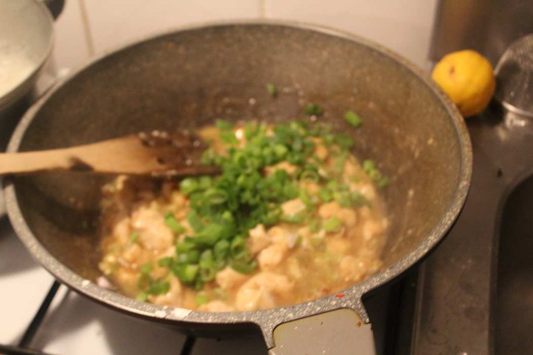 Herd abstellen und die verbliebenen Lauchzwiebeln in den Wok geben.