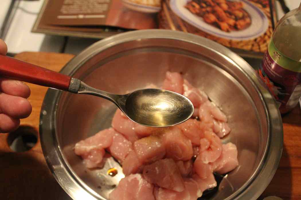 Alle Zutaten miteinander vermischen und das Fleisch eine halbe Stunde marinieren lassen. Das ist bei mir nicht schlimm, denn so kann ich das Fleisch eben fertig machen, während meine Frau den Kindern eine Gutenachtgeschichte vorliest, oder während sie sich im Badezimmer bettfein machen und danach vergeht die halbe Stunde schneller als einem lieb ist bei, ich will noch, ich will nicht, wir wollen aber noch, da ist ein Geist unter meinem Bett, ich will aber die CD hören, nein die hatten wir erst lalalala…