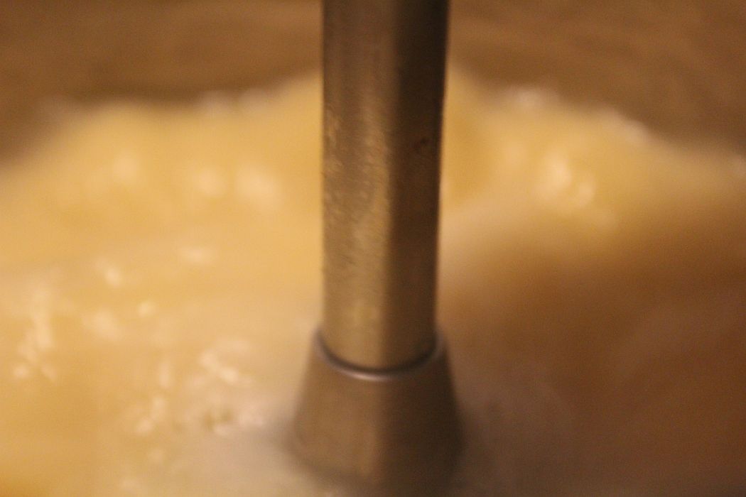 Wenn die Brühe mit der Butter heiß ist, mit dem Pürierstab die zwei bis drei Kartoffeln mit dem Pürierstab zerkleinern, damit das Salatdressing Bindung bekommt.