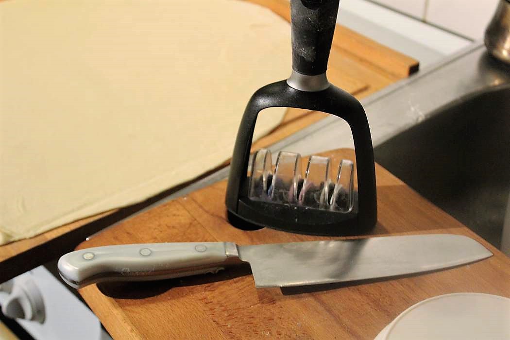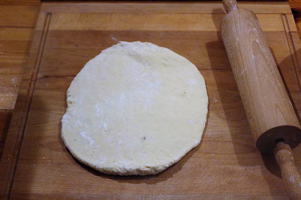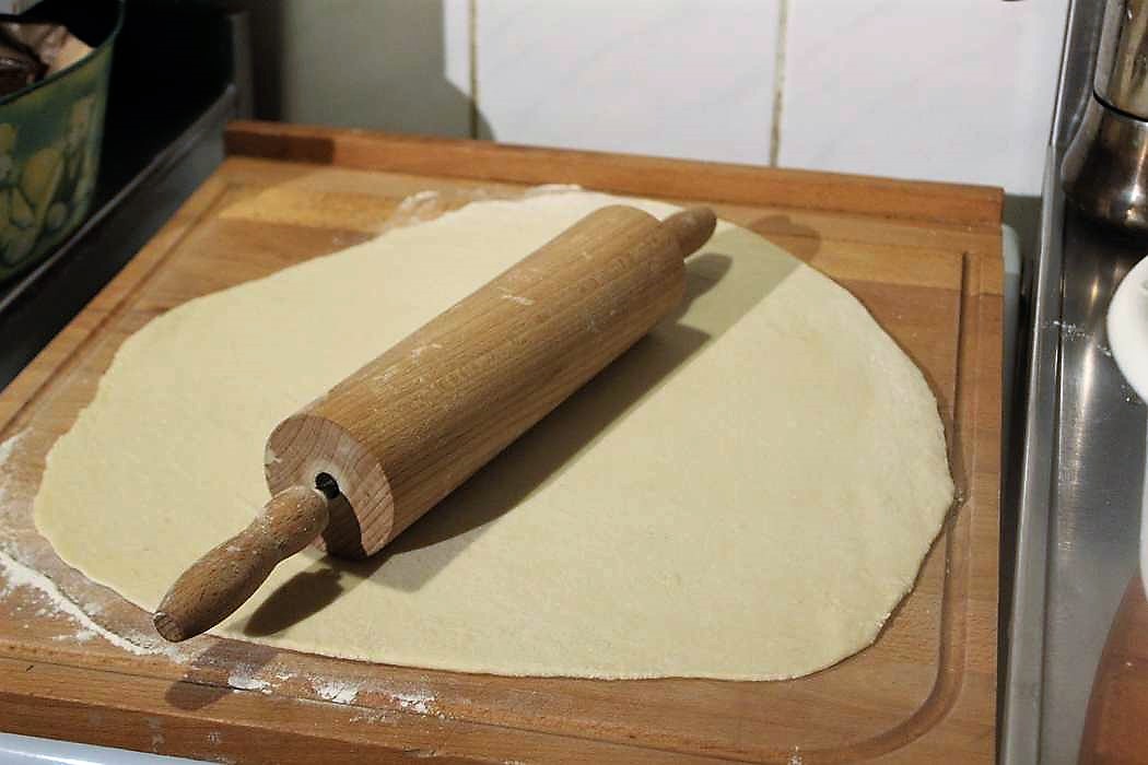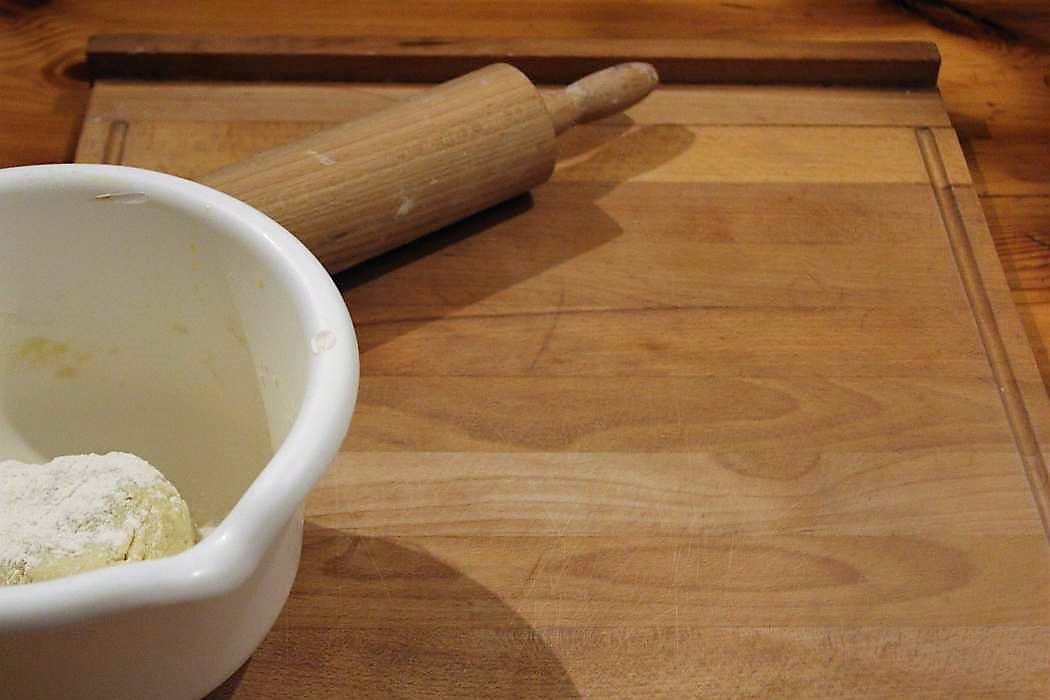 Bei Bedarf noch ein wenig nachmehlen und den Teig beim Ausrollen auch mal umdrehen, damit er nicht am Brett verklebt.
