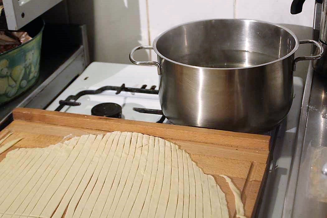 Wenn das Wasser kocht, die Nudeln hinein geben. Wenn die Nudeln dünn gerollt sind, sind sie automatisch gar, wenn sie an die Wasseroberfläche steigen.