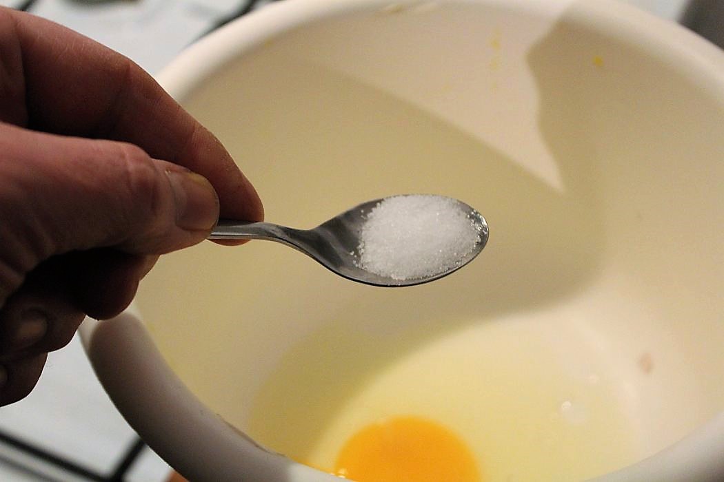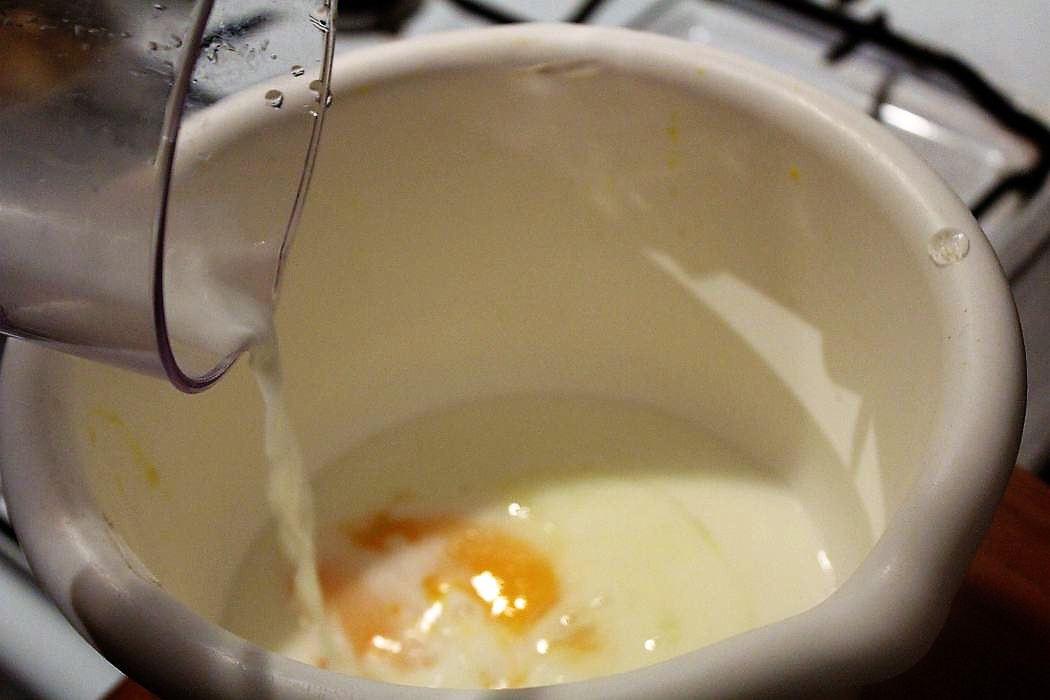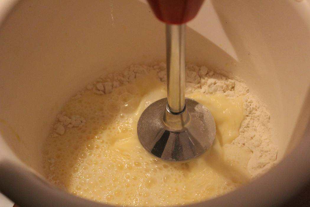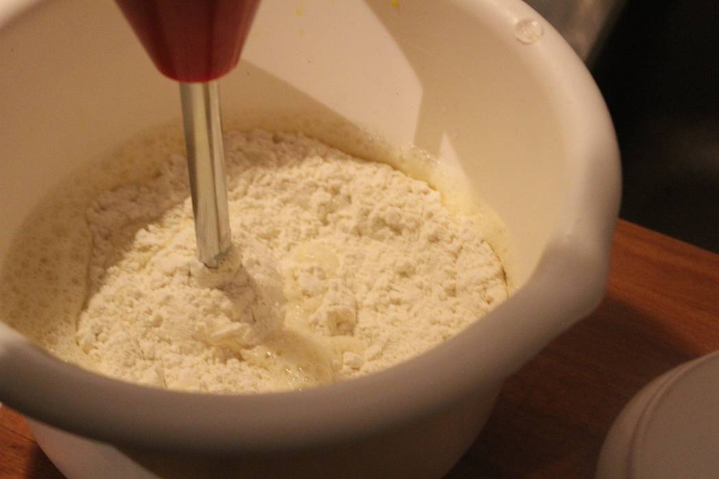 Ei mit der Milch verrühren und dann langsam immer Mehl in die Schüssel geben und mit der Flüssigkeit verrühren.