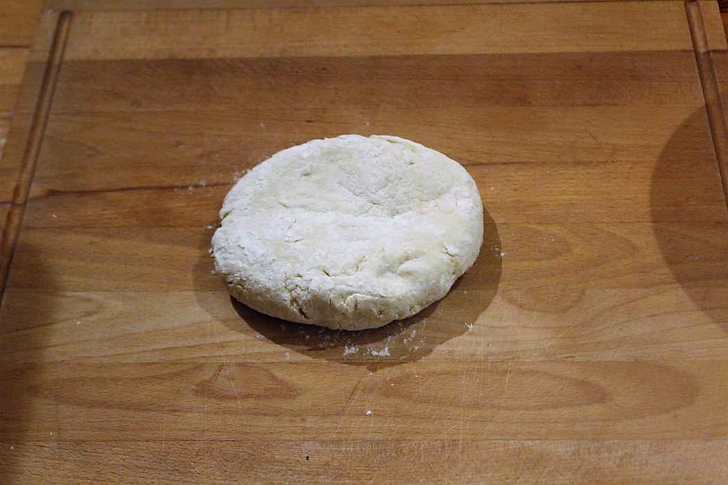 Teig auf eine Unterlage legen und mit den Händen flach drücken.