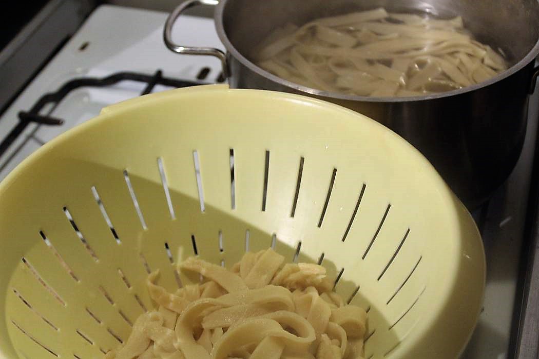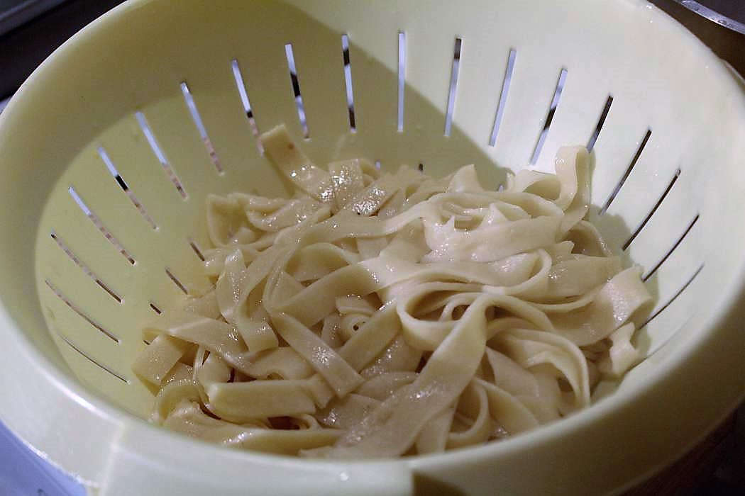 Nudeln kocht man etappenweise. Die fertigen Nudeln lagere ich in einem Sieb.