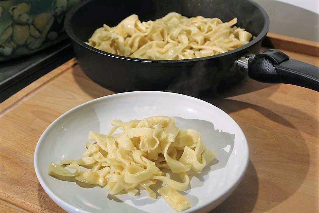 Ich habe die Bandnudeln noch einmal geteilt. Hätte ich wegen mir nicht gemacht, aber für die Kinder am nächsten Tag und auch für meine Frau. Die würden die volle Länge der Nudeln sonst bemängeln.