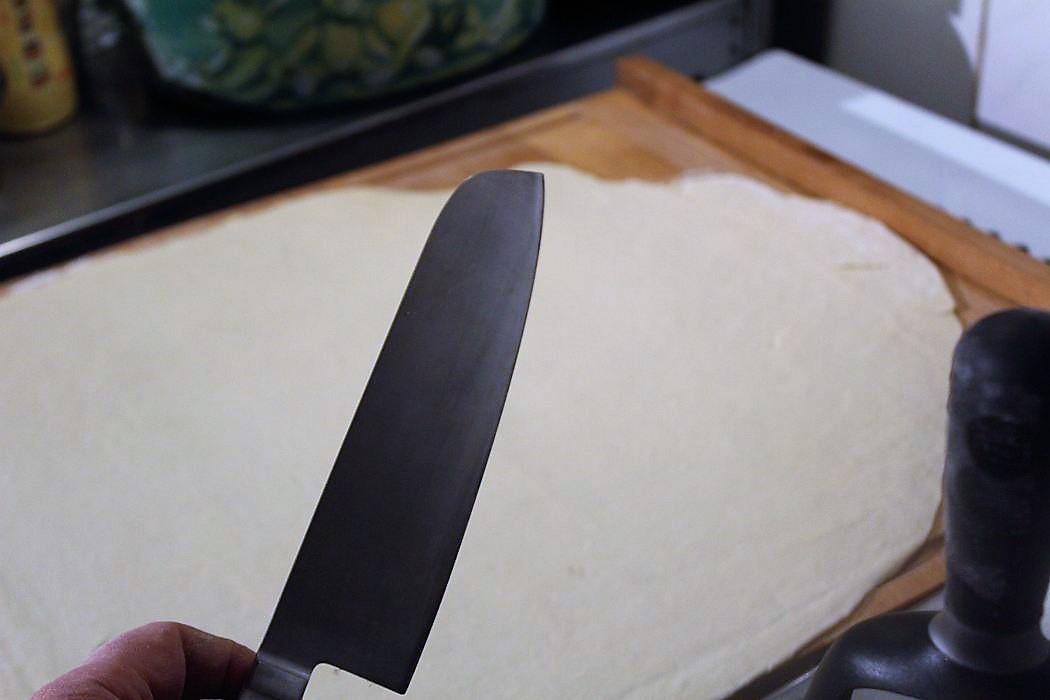 Die Bandnudeln schneide ich freihändig. Das darf und soll man auch sehen, dass es Handarbeit ist.