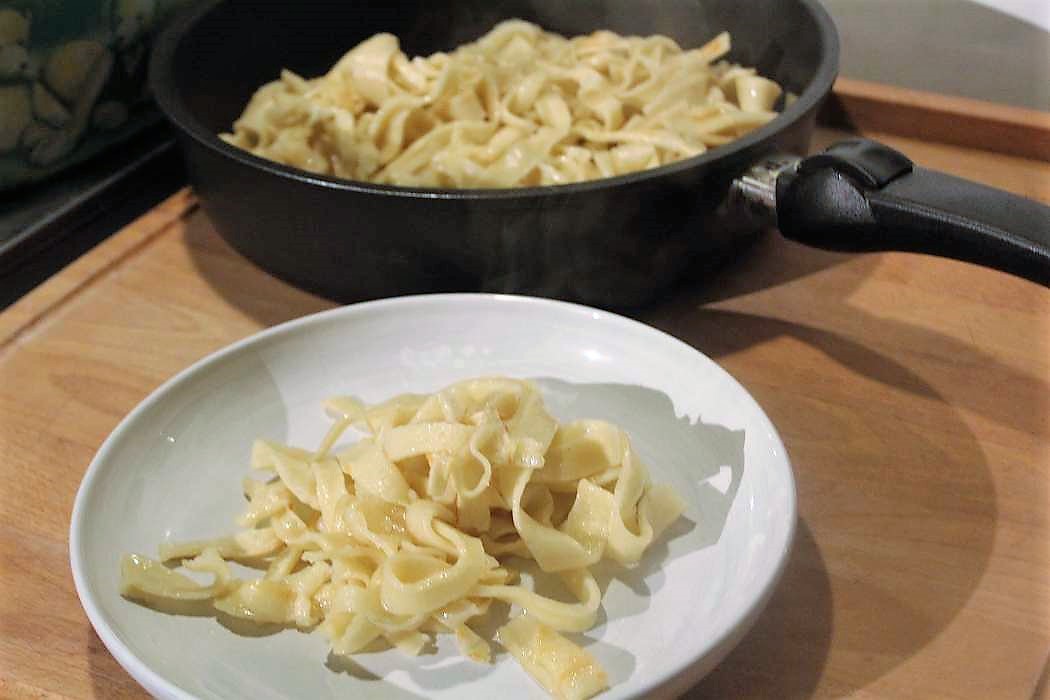 Ich habe die Bandnudeln noch einmal geteilt. Hätte ich wegen mir nicht gemacht, aber für die Kinder am nächsten Tag und auch für meine Frau. Die würden die volle Länge der Nudeln sonst bemängeln.
