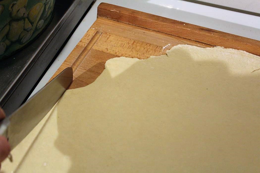 Bei Bedarf noch ein wenig nachmehlen und den Teig beim Ausrollen auch mal umdrehen, damit er nicht am Brett verklebt.