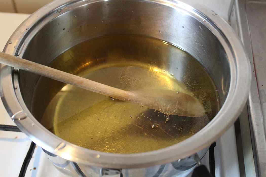 1,5 Liter Rapsöl für die Pommes in einem Topf erhitzen, bis Blasen an dem Kochlöffel aufsteigen