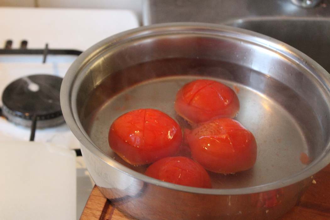 4 Tomaten auf dem Rücken über Kreuz einschneiden.