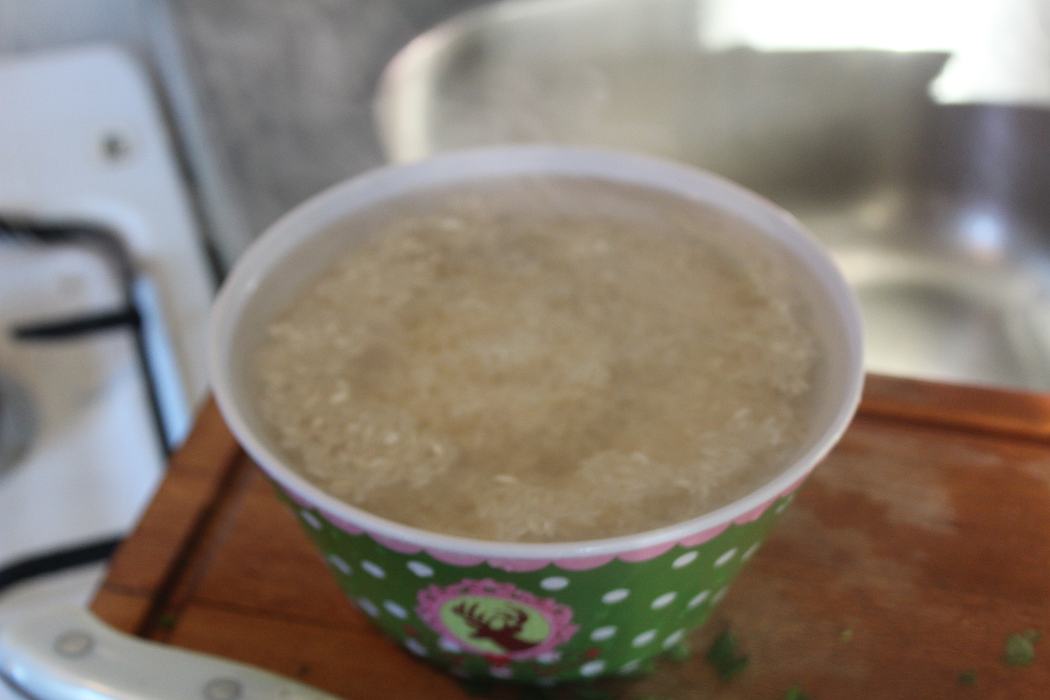 Schon mal einen Liter heiße Brühe in Position bringen. Wer das vegetarisch machen will, nimmt Gemüsebrühe, ansonsten bietet sich Hühnerbrühe an. Im Grunde genommen geht aber jede Brühe.