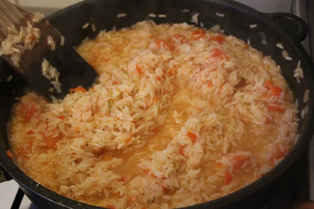 Alles vermischen und dann die Brühe zum Reis kippen.