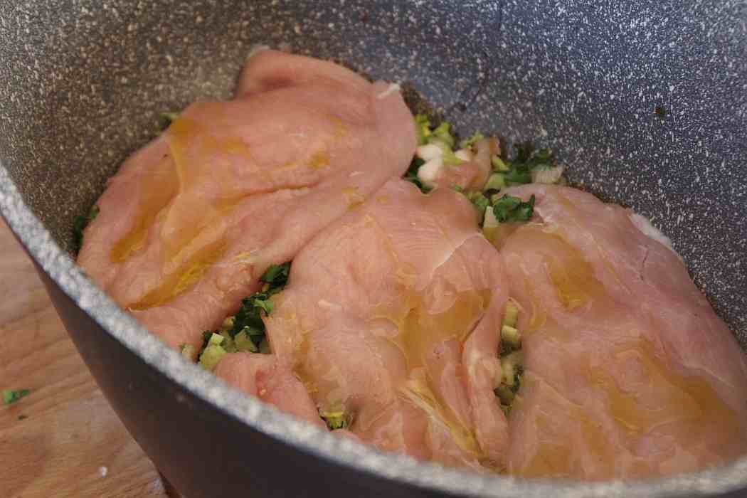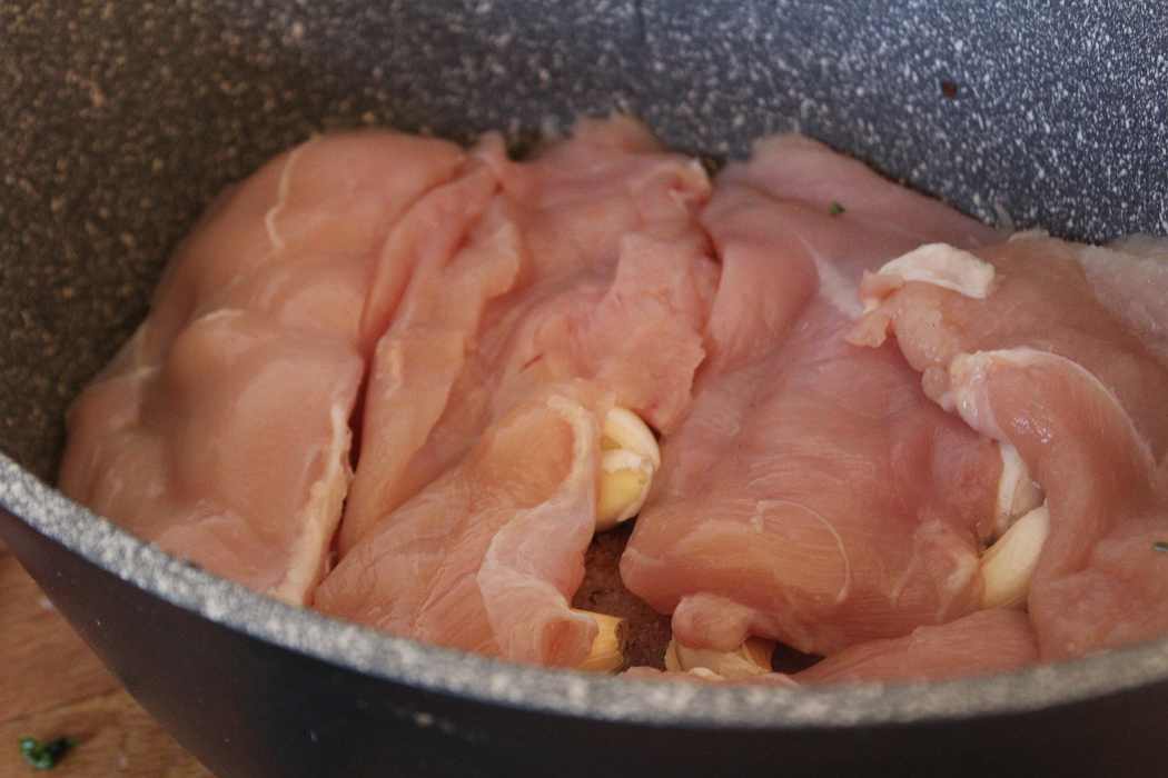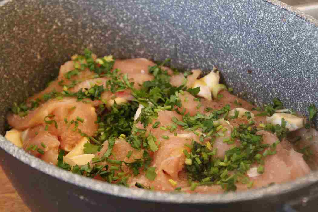 Hühnerbrust steht ja im Ruf eher zäh zu werden, wenn man nicht aufpasst, deswegen arbeiten wir hier nur mit verhältnismäßig geringer Garzeit. Wenn man die einhält ist das Huhn super zart.