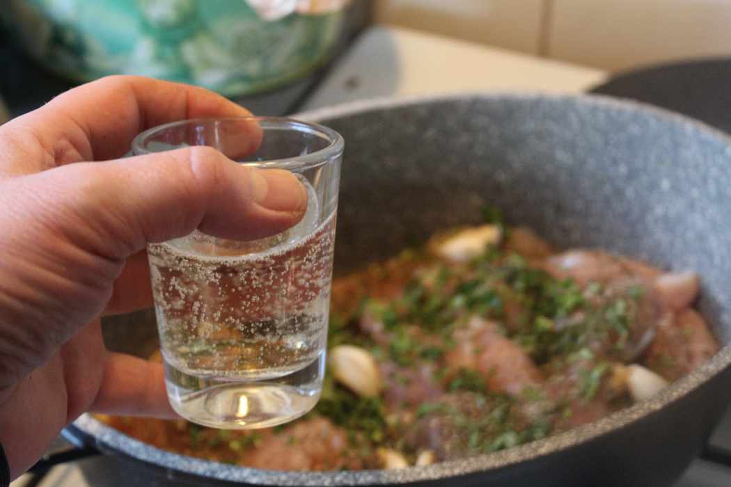 Jetzt noch 0,1 Liter Weißwein trocken. Ich habe Muttis schalen Prosecco genommen, der noch auf der Fensterbank stand und sowieso nicht mehr getrunken wird.
