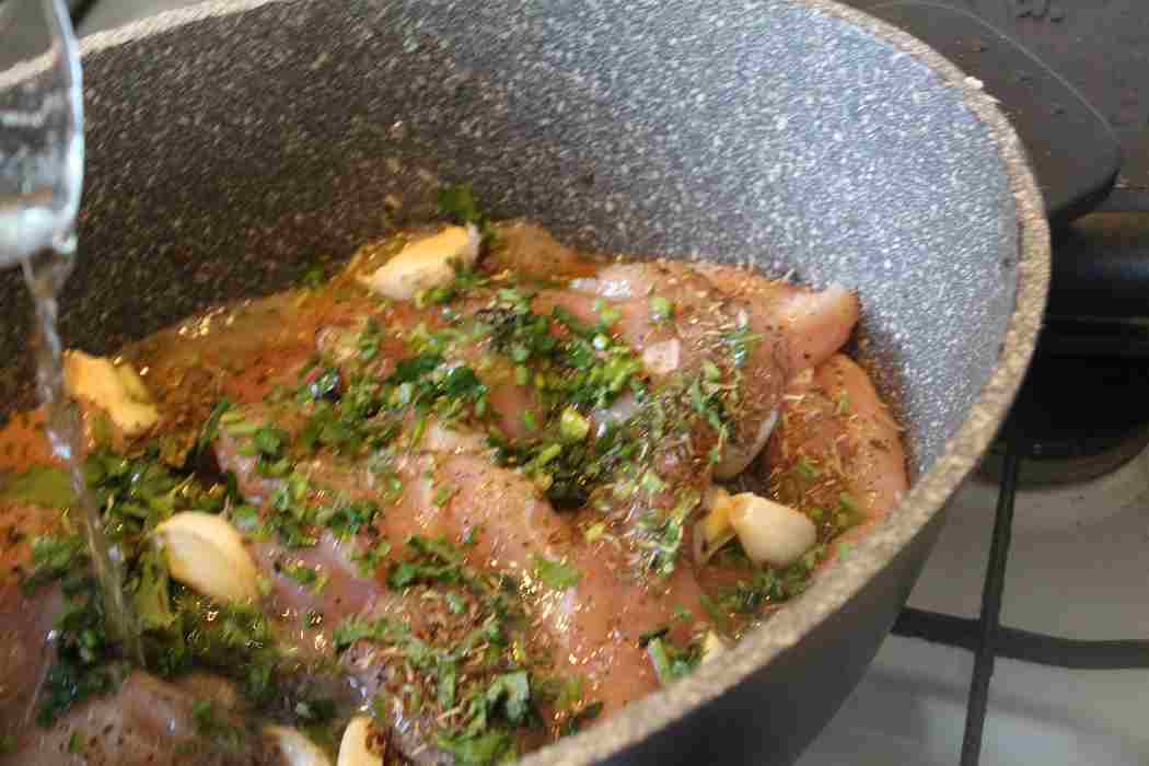 Fleisch auf den Teller legen. Das Grün kommt vom Sellerie und der Petersilie, bzw. Koriander.