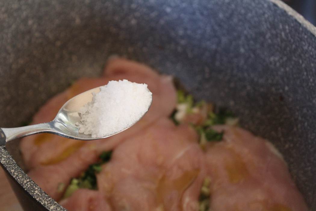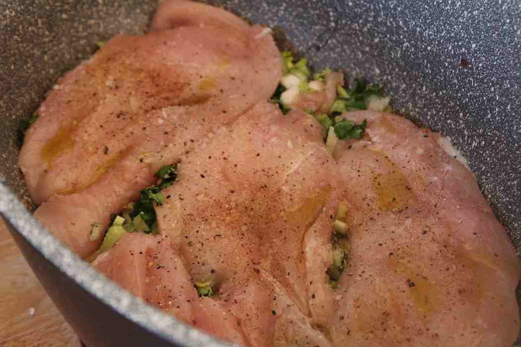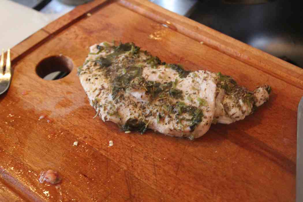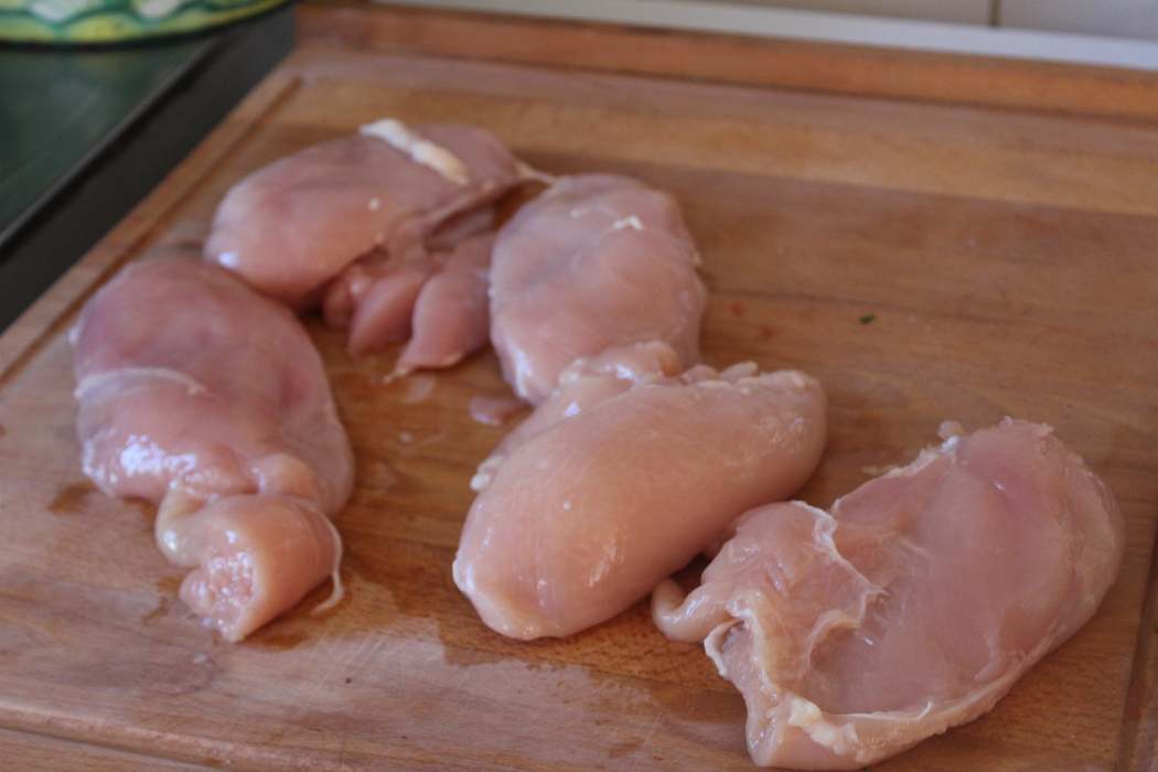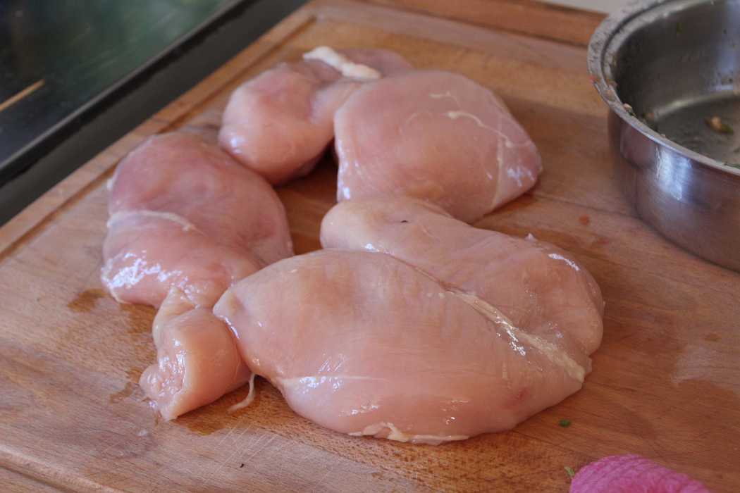 Mit dem Schmetterlingsschnitt die Hühnerbrust halbieren, damit sie nicht so dick ist.