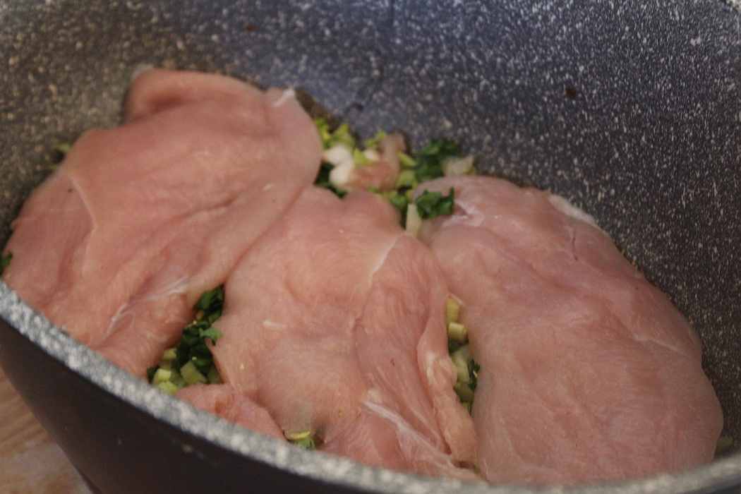 Das gehackte Gemüse müsst Ihr Euch ein bisschen aufteilen zwischen den Lagen Fleisch, die jetzt gleich in den Bräter kommen.