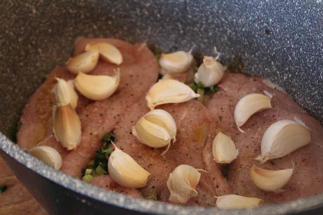 Hier sind die 40 Knoblauchzehen. Die bleiben in der Schale. Deswegen solltet Ihr den Knoblauch in bio Qualität nehmen. Wer weiß was die Chinesen da sonst schon wieder drangesprüht haben.