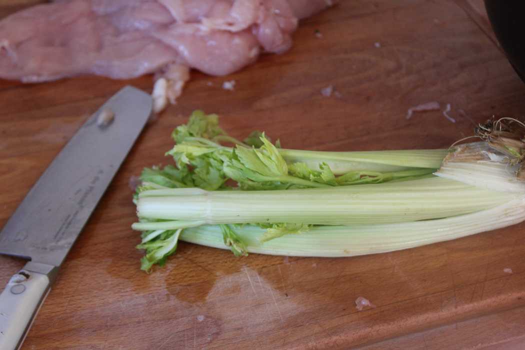 Staudensellerie zerkleinern. Das Blattwerk ist auch gut, bloß nicht wegwerfen. Das verarbeiten wir mit.