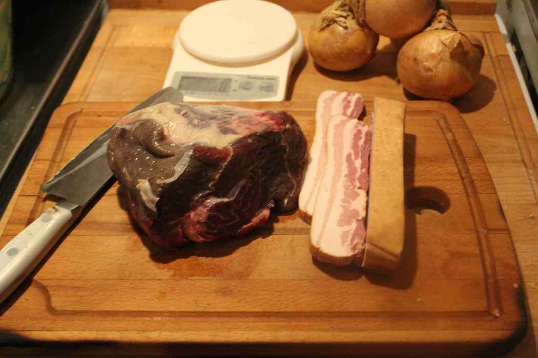 Ich habe ein Kilo Muskelfleisch aus der Rinderwade verwendet. 700 Gramm Zwiebeln, 100 Gramm Schinkenspeck, aber ich hatte noch Bacon vom Aktivstallschwein, der erschien mir aus Qualitätsgründen die bessere Alternative zu sein.