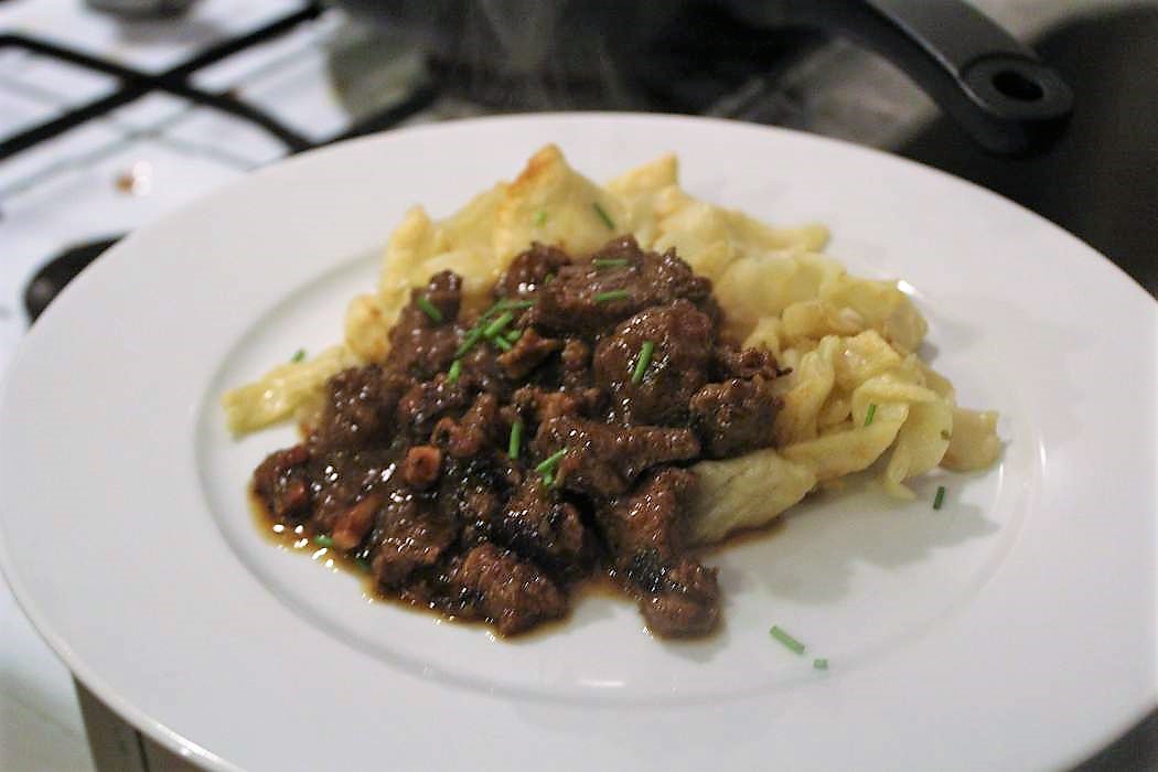 Für Erwachsene finde ich einen flachen Teller passender. Das Fleisch ist schön zart, geschmacklich ist es dezent gekräutert und würzig vom Bacon. Von den ganzen Zwiebeln sieht man überhaupt nichts mehr. Die sind total verkocht. Die Soße ist sehr lecker und passt prima zu den selbst gemachten Nudeln, die in den Tagen nach der Rezeptveröffentlichung schon für reichlich Aufregung gesorgt haben, weil ein paar Tropfen Milch zur besseren Verarbeitung drin sind. Ich habe die Nudeln dieses Mal nur mit Wasser gemacht, aber dann lässt der Teig sich gar nicht so gut handhaben. Also alles vergessen, was Euch andere über Nudeln erzählen und wirklich den Teig mit Milch machen. Das ist ein absolutes Wohlfühlessen und deswegen sehr zu empfehlen