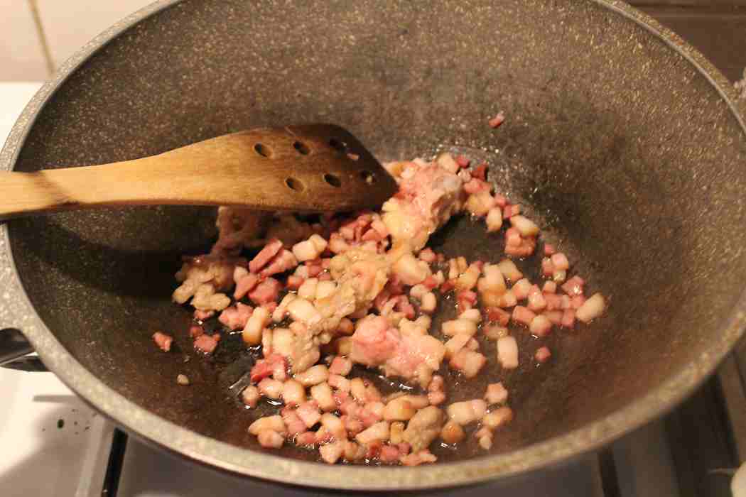 100 Gramm Schinkenspeck in Scheiben schneiden.