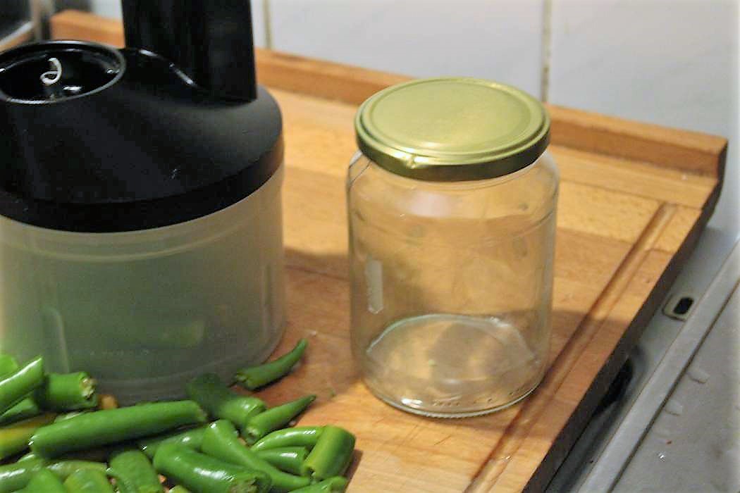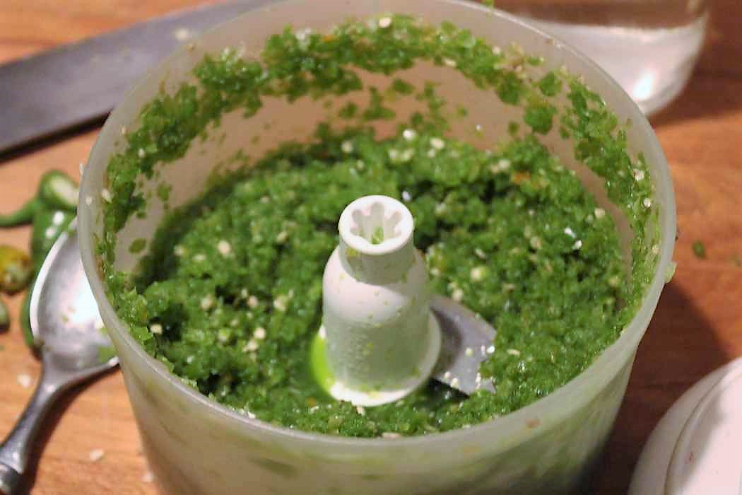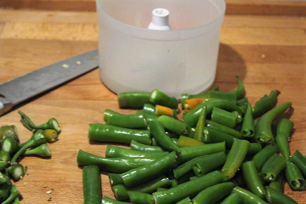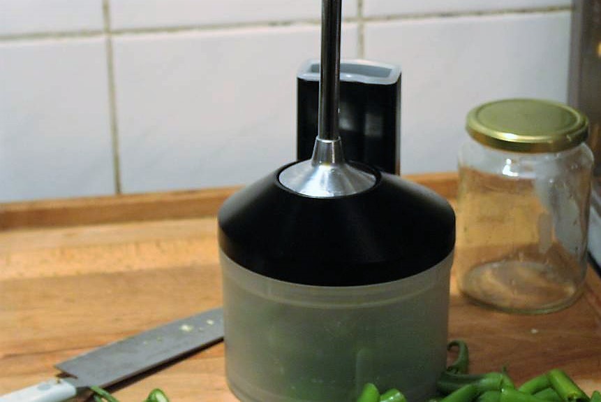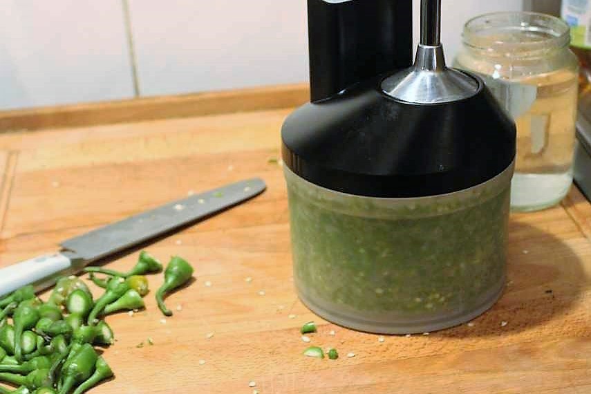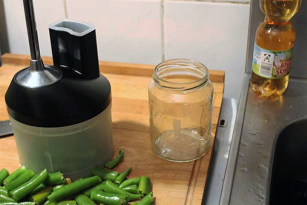 Peperoni grob zerkleinern. Zum weiteren  Zerkleinern der Peperoni könnt Ihr einen Pürierstab, eine Küchenmaschine, oder wie ich eine Zauberette benutzen. Die ist ein Zubehörteil meines ESGE Zauberstabes.