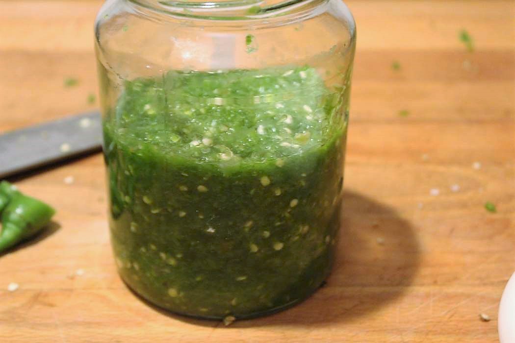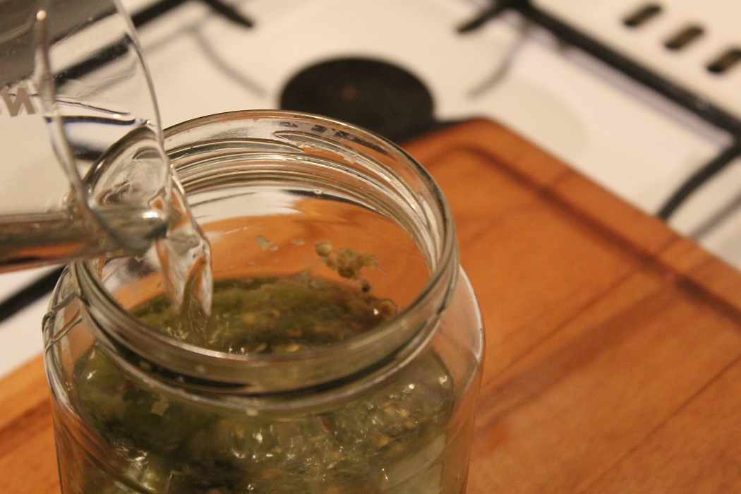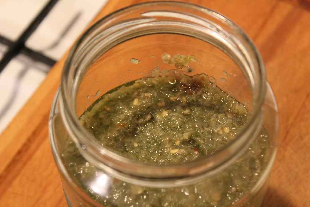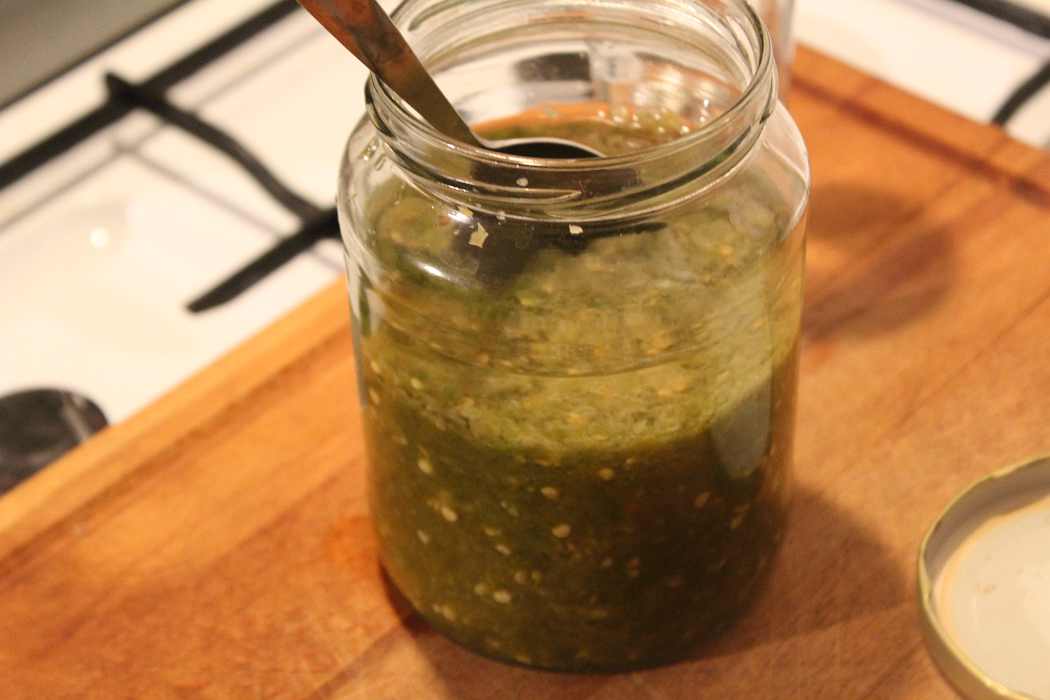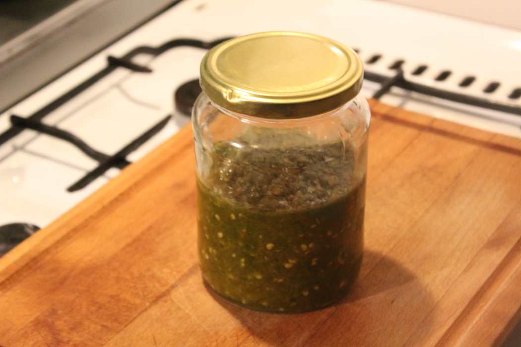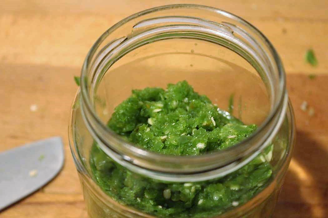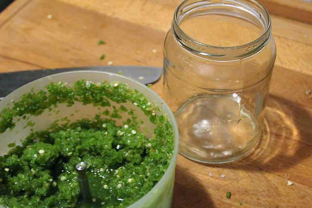 Die gesalzene Peperonimasse in das heiß ausgespülte Glas umfüllen.