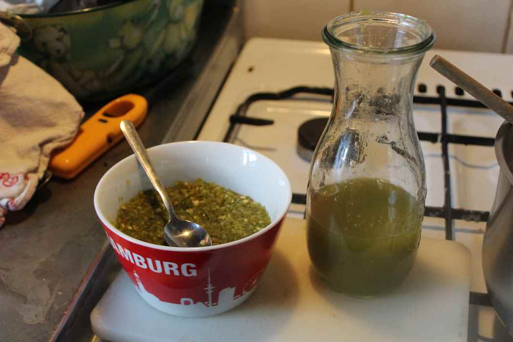 In der linken Schüssel ist jetzt die ausgepresste Masse und rechts ist der Tabasco. Man muss die Masse nicht wegwerfen. Ich habe sie in den Kühlschrank gestellt und die schmeckt ganz toll auf Pizza, oder immer wenn man selbst irgendwas schärfer essen möchte, als die anderen am Tisch. Dann kann man sich davon etwas auf das Gericht löffeln und die anderen haben mit der individuellen Schärfung nichts zu tun. Das grüne Peperonizeug ist aber echt total für Mädchen. Das schmeckt lecker würzig, kratzt aber nicht einmal im Hals.