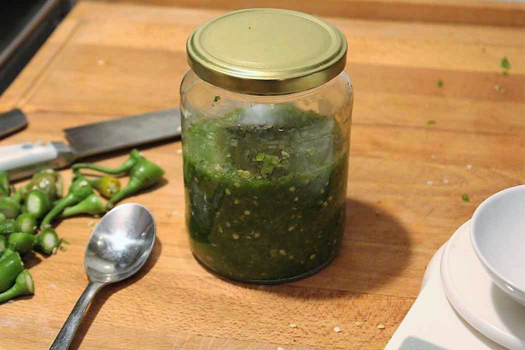 Nun kommt der Moment, auf den ich fünf Wochen lang gewartet habe. Wir machen Tabasco aus dem fermentierten Peperonimus.