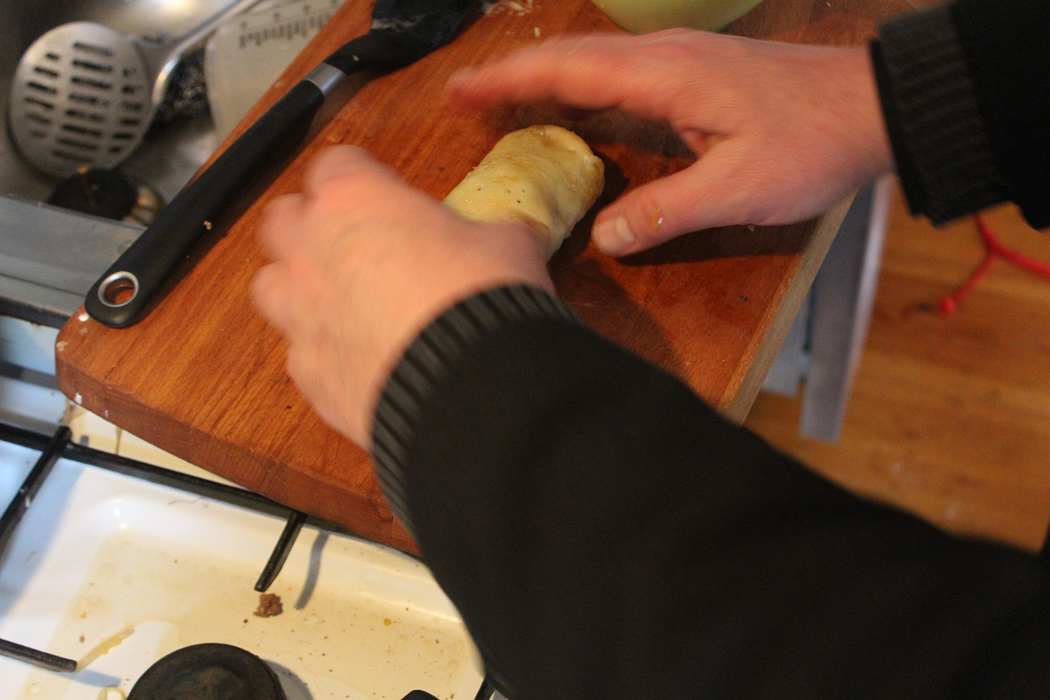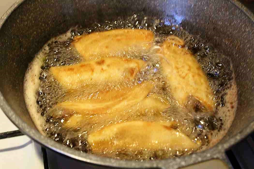 Nicht von beiden Seiten in die Pfanne garen, nur von einer Seite. Der Teig soll noch weich und beweglich sein, ohne zu reissen.