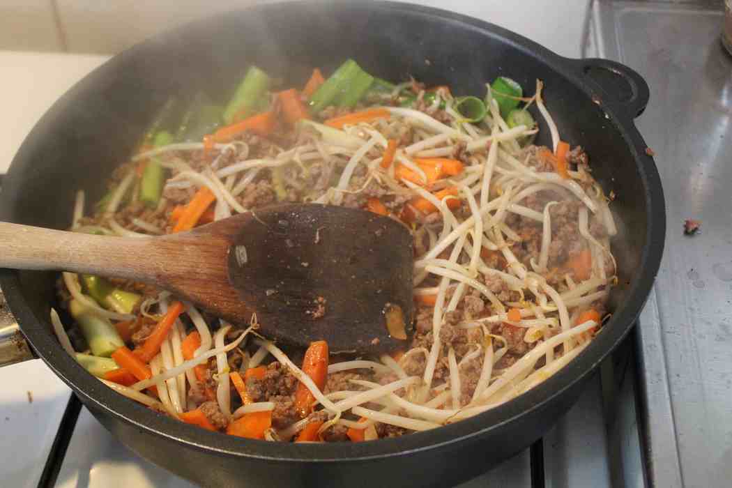 Das Rinderhack soll krümelig braten, damit es sich gut in den Frühlingsrollen verteilt.
