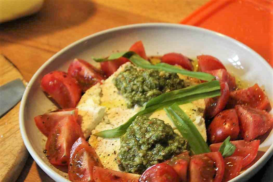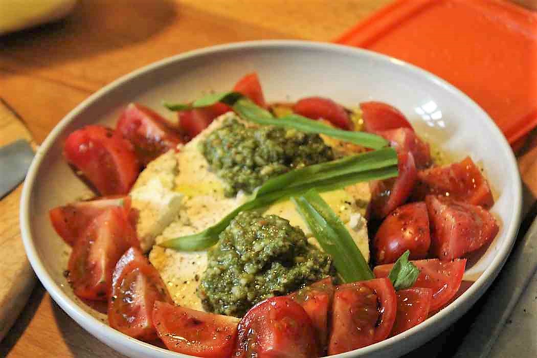 Der Frischkäse ist schön cremig, die Mandeln im Pesto geben ein knuspriges Mundgefühl. Die Säure des Rotweinessigs und der Zitrone knallen dazu richtig.