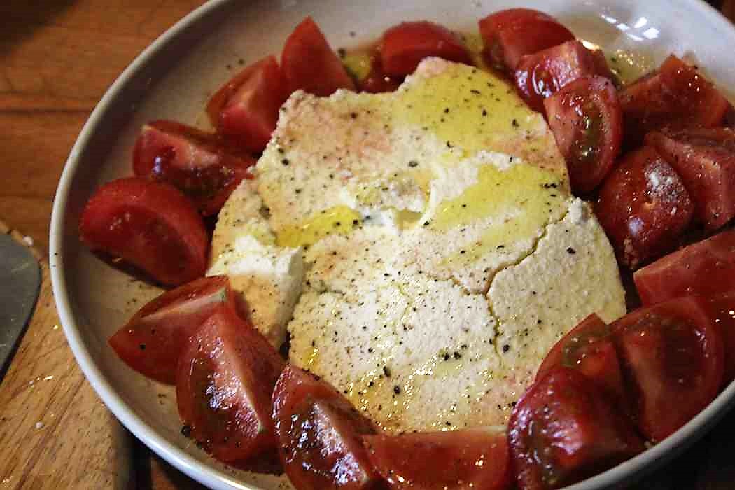 Tomaten in Stücke schneiden, Olivenöl, Rotweinessig, Salz und Pfeffer aus der Mühle.