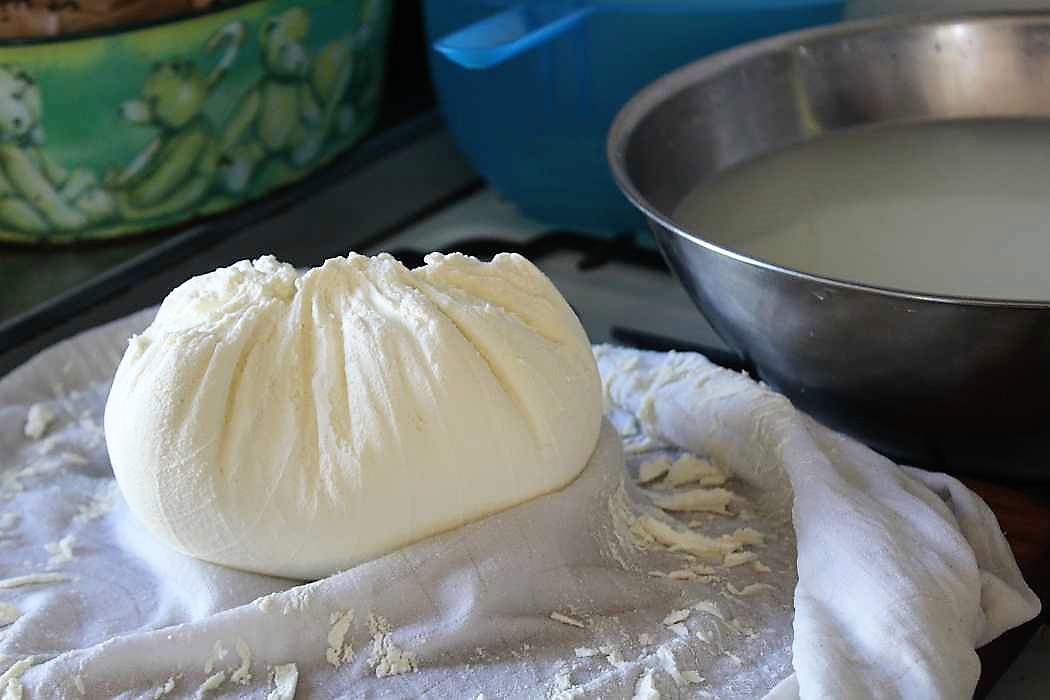 Hier seht Ihr meinen Frischkäse frisch aus der Molke gehoben und aus dem Tuch geholt.