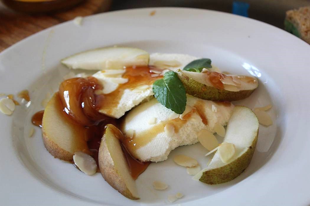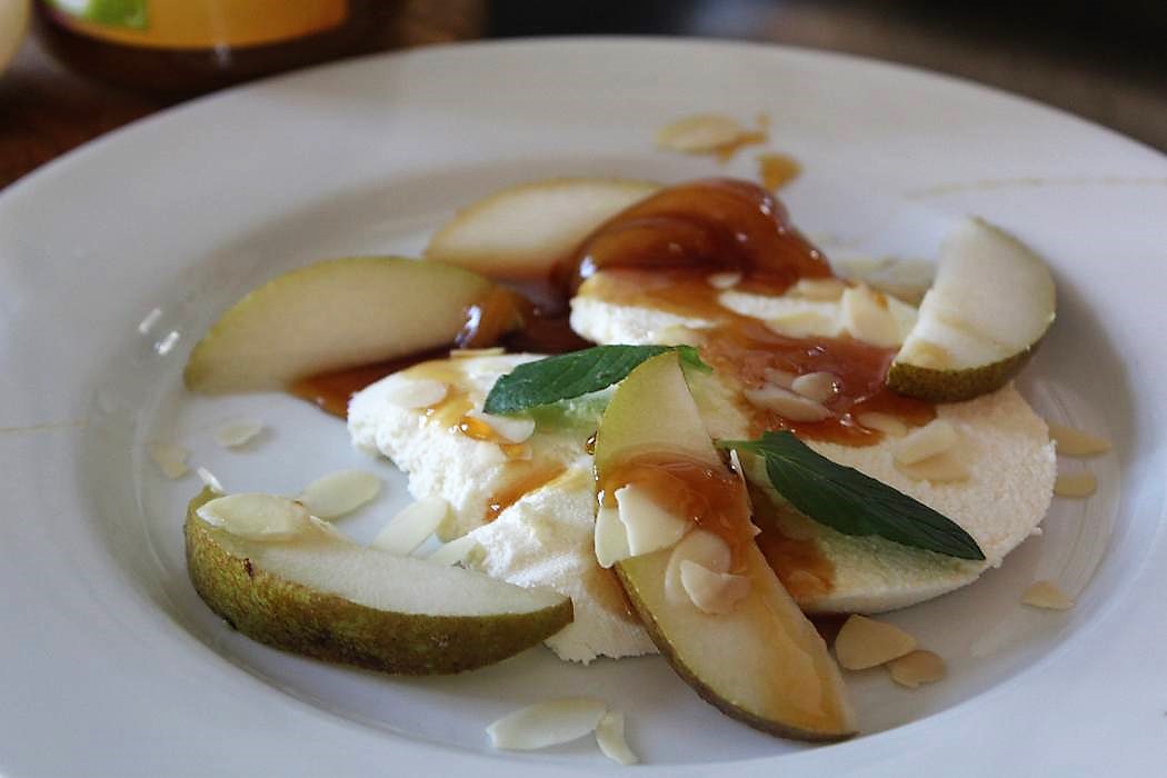 Frischkäse zum Frühstück mit Birnen, Honig und Mandeln