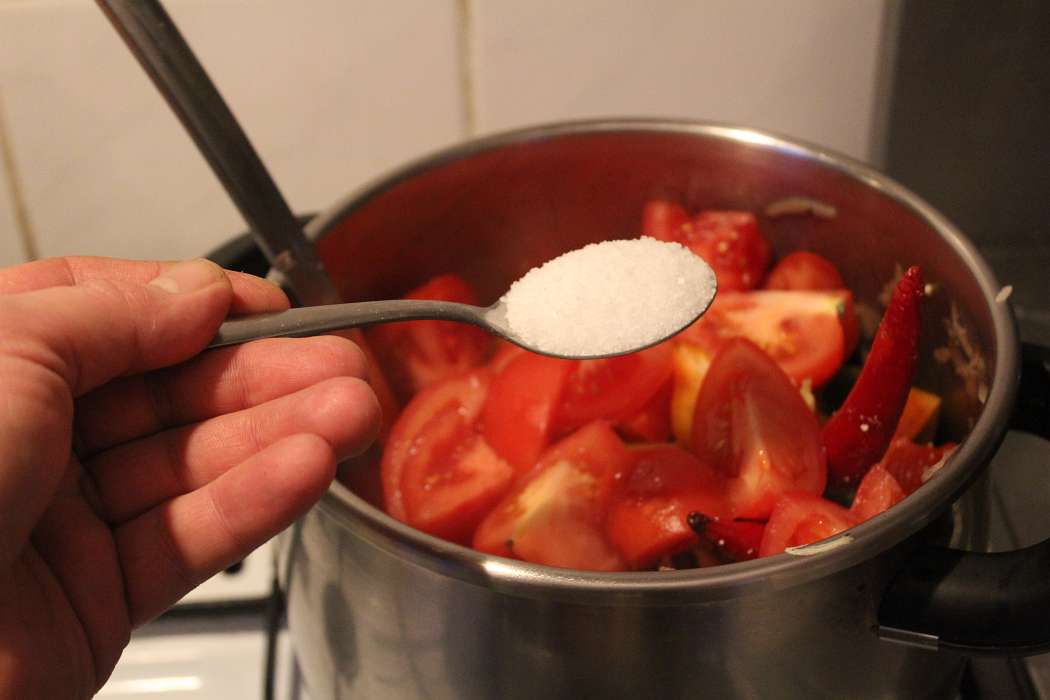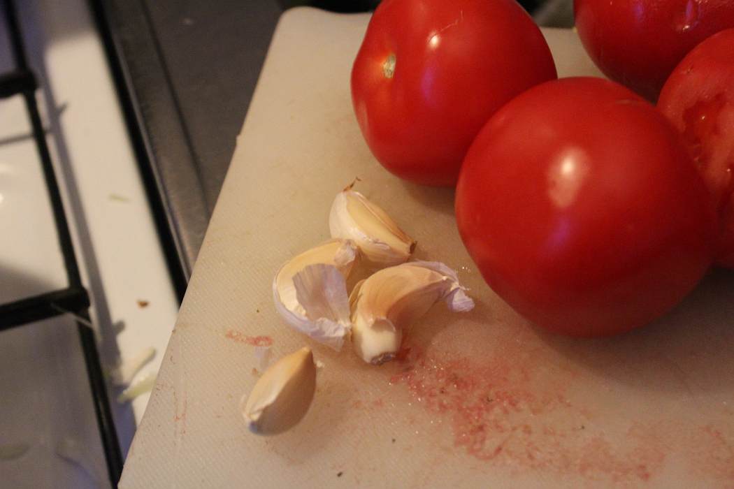 Paprika mundgerecht schneiden, Tomaten zerkochen später, die müssen nicht so klein.