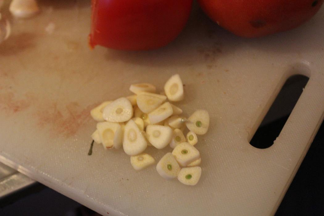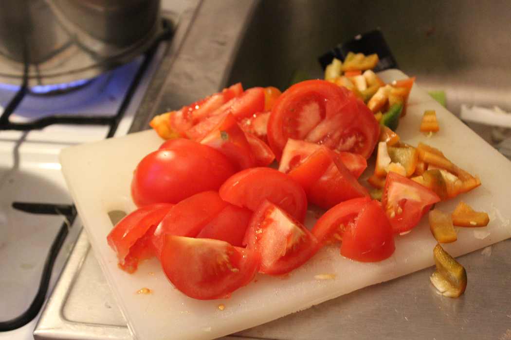 Jetzt noch Tomaten und Paprika zerkleinern.